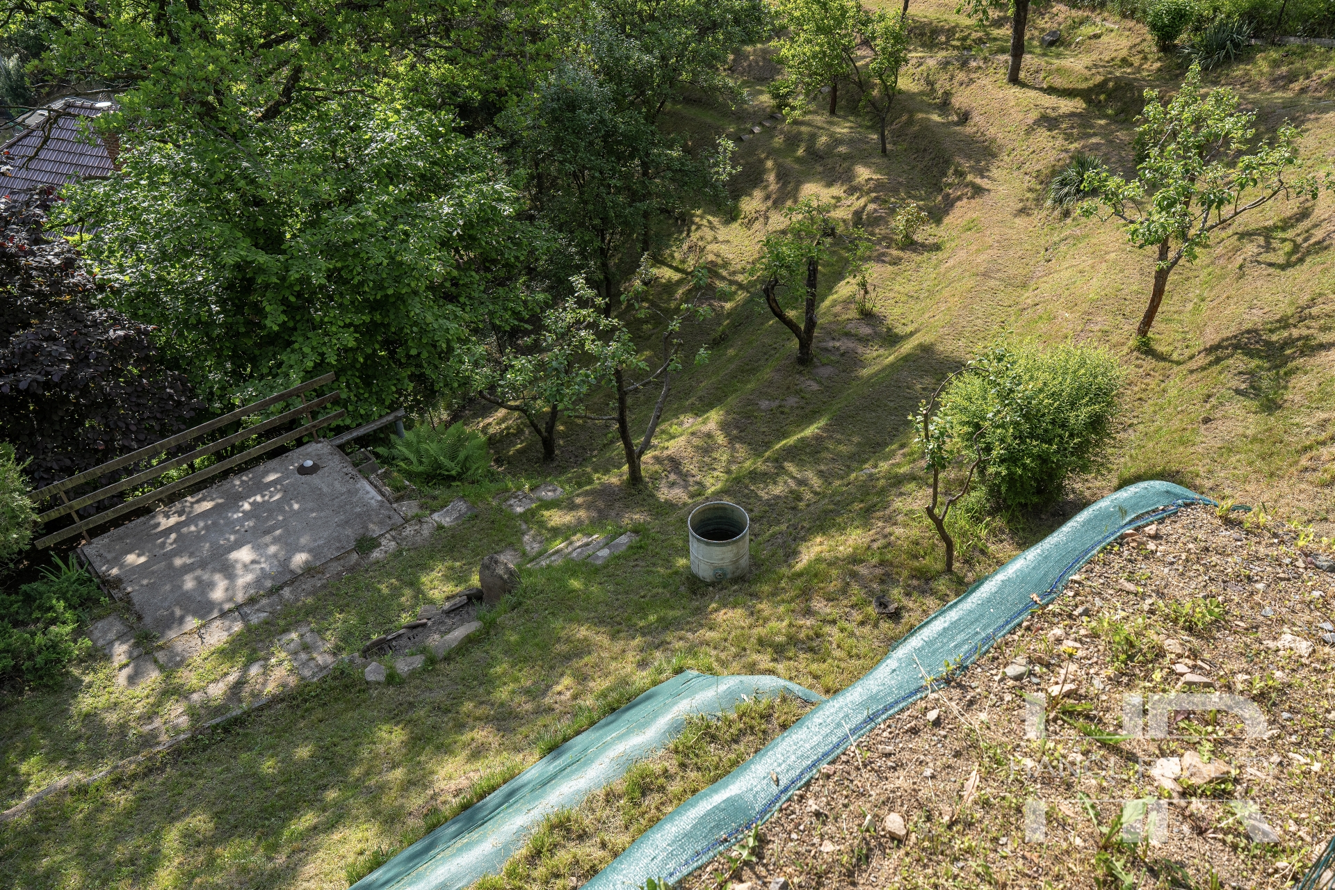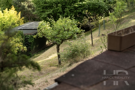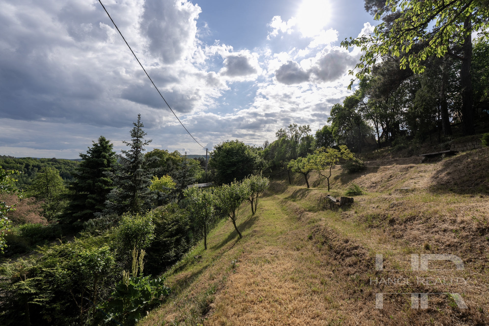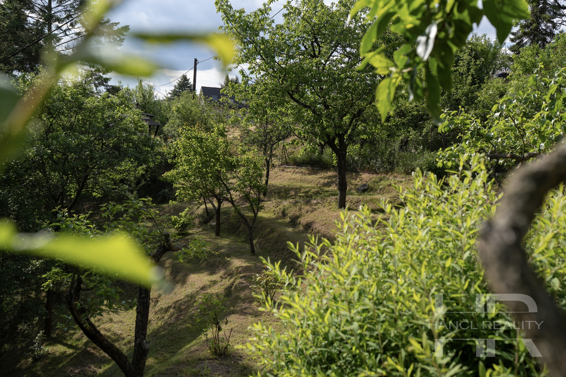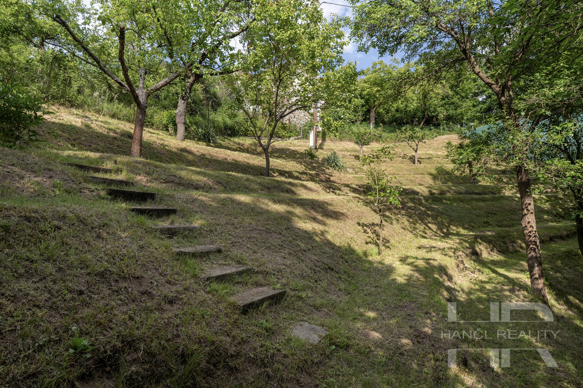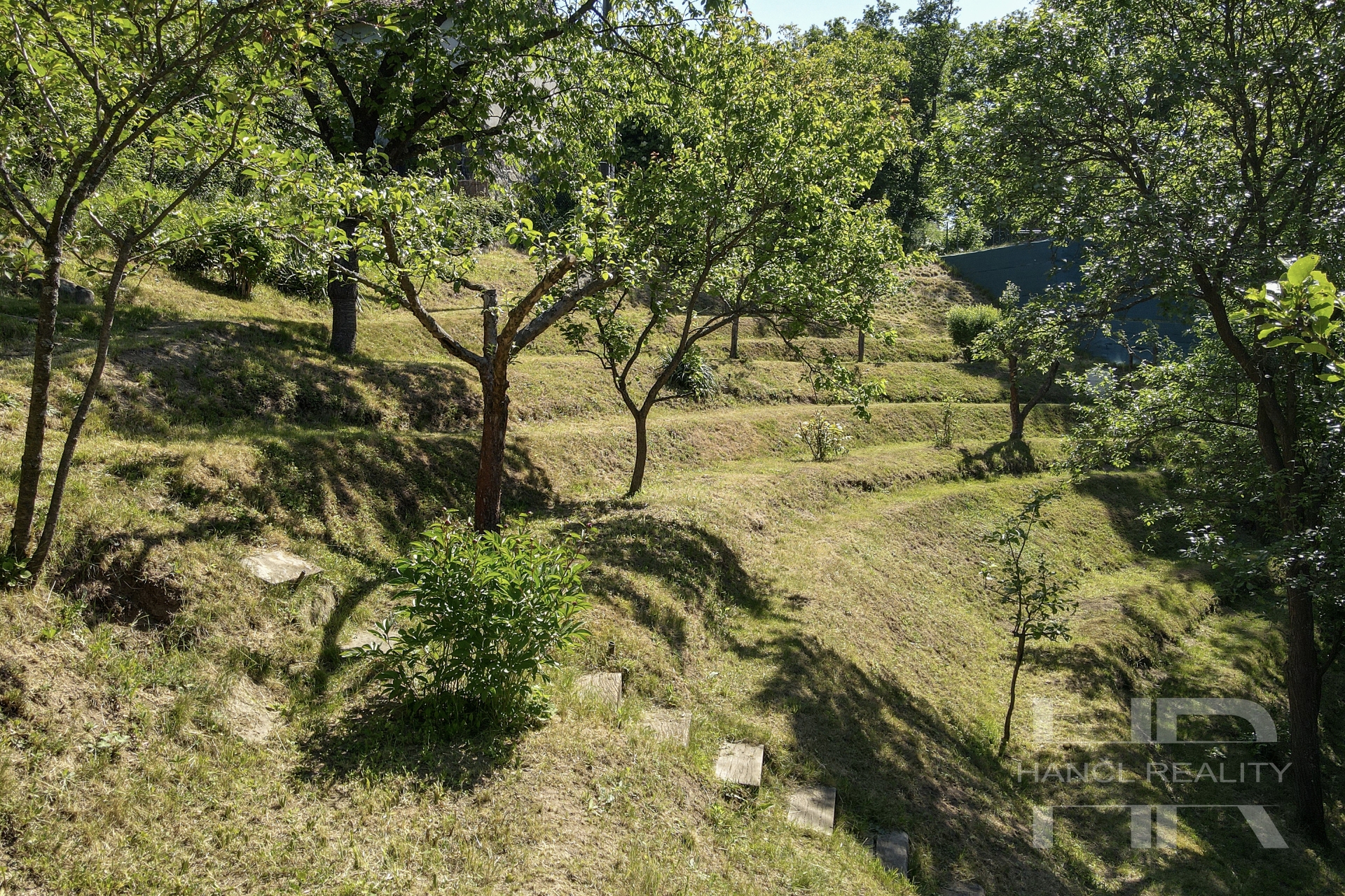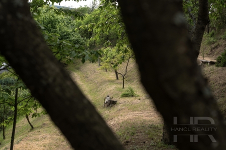 Pozemek je kaskádovitý, s množstvím ovocných a okrasných stromů a keřů. Rovinu tu nehledejte, ale právě díky terénu si tu můžete užít výhledy, které jen tak neomrzí.