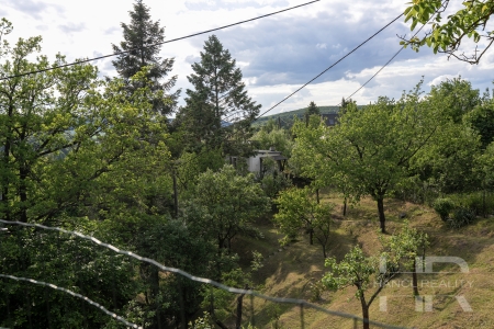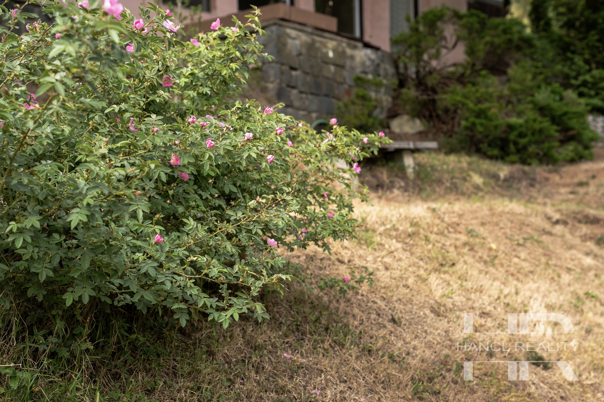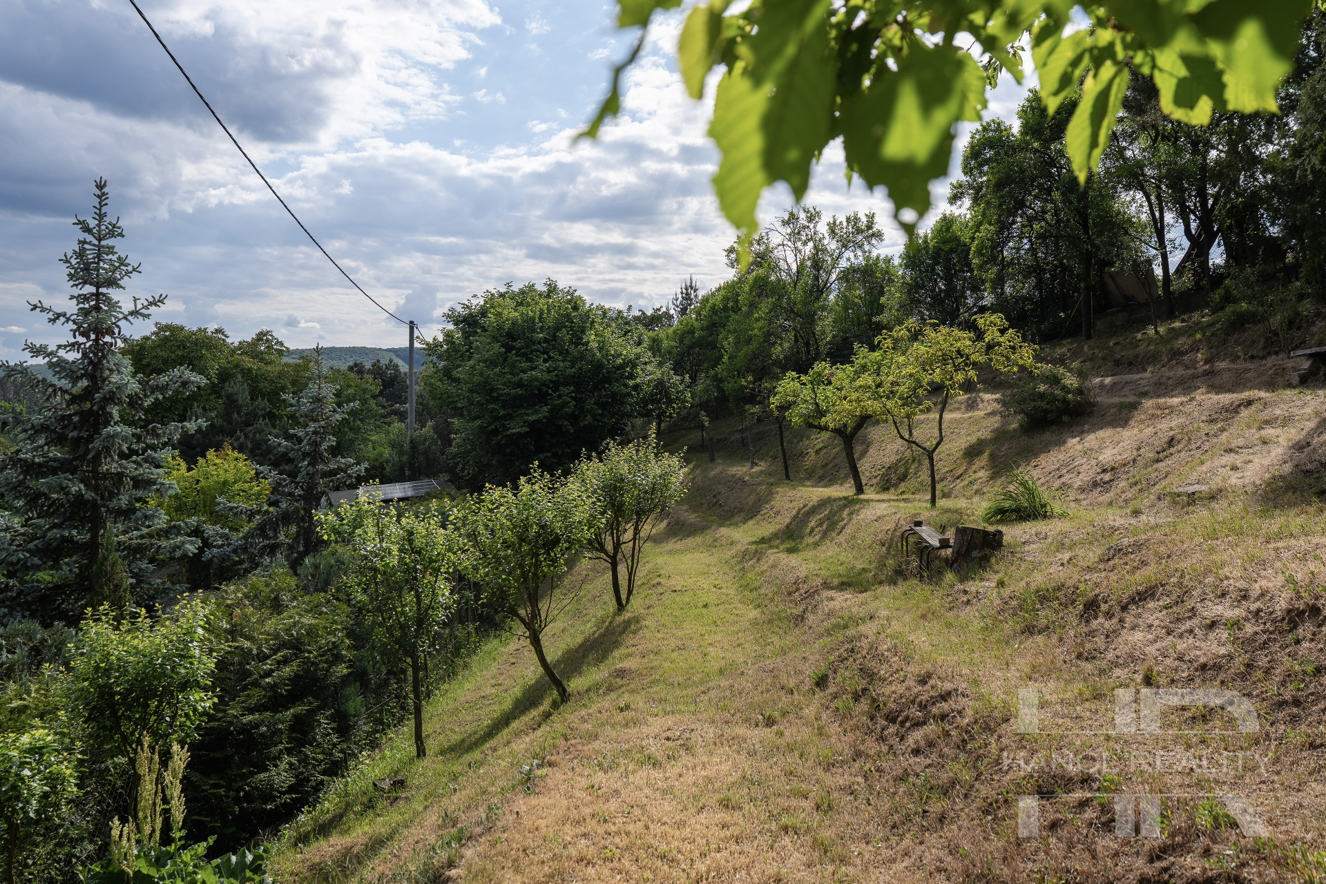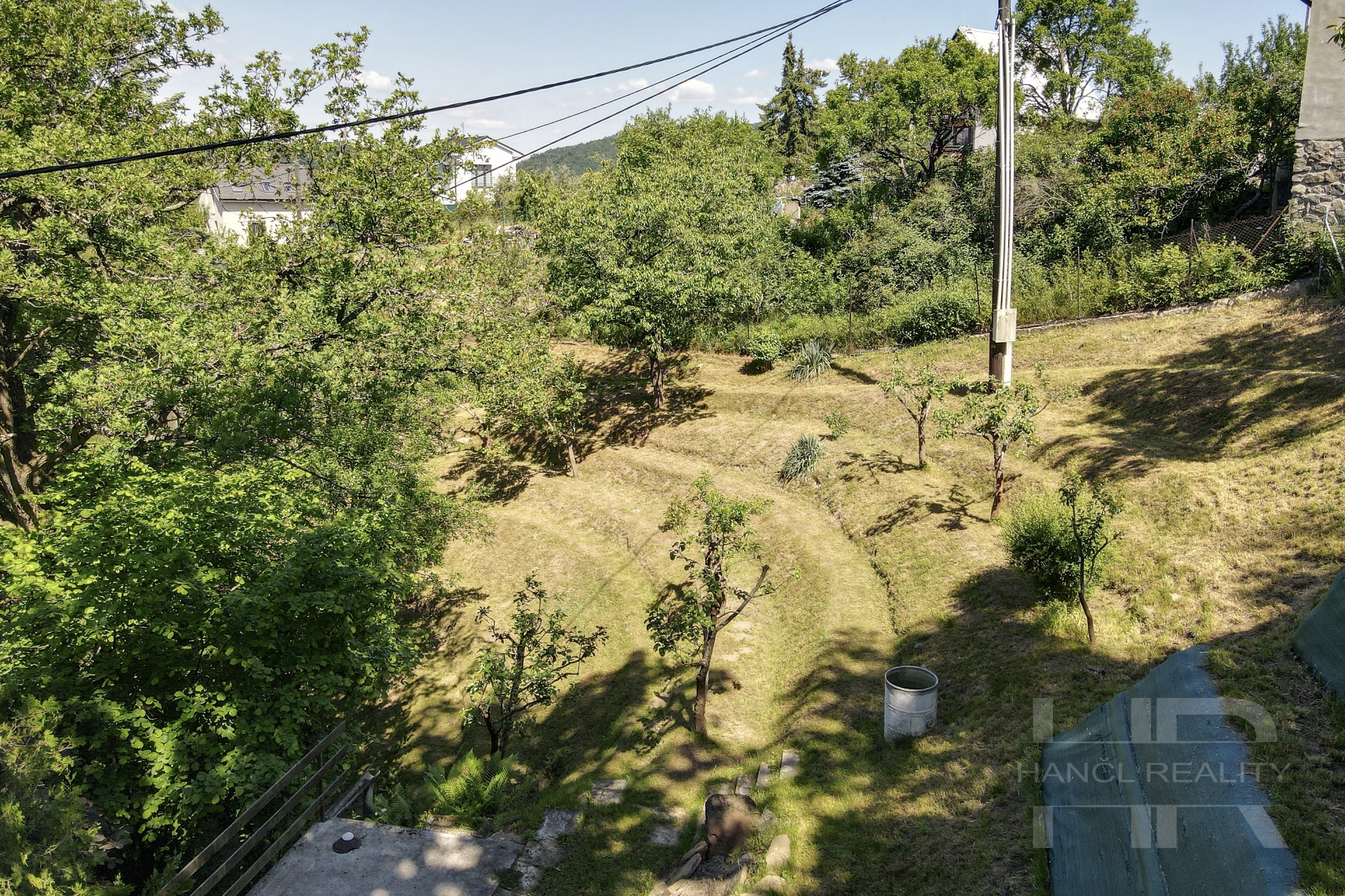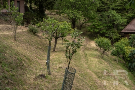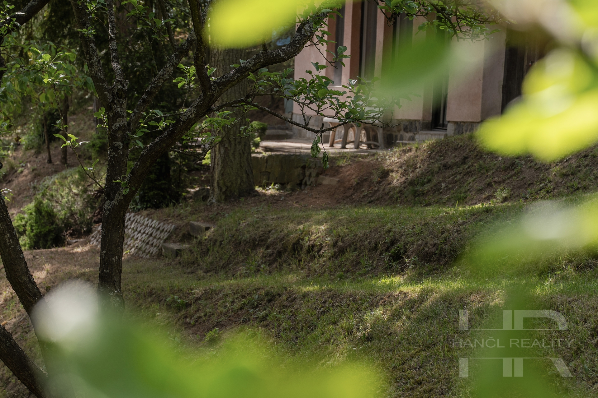 Pozemek je kaskádovitý, s množstvím ovocných a okrasných stromů a keřů. Rovinu tu nehledejte, ale právě díky terénu si tu můžete užít výhledy, které jen tak neomrzí.
