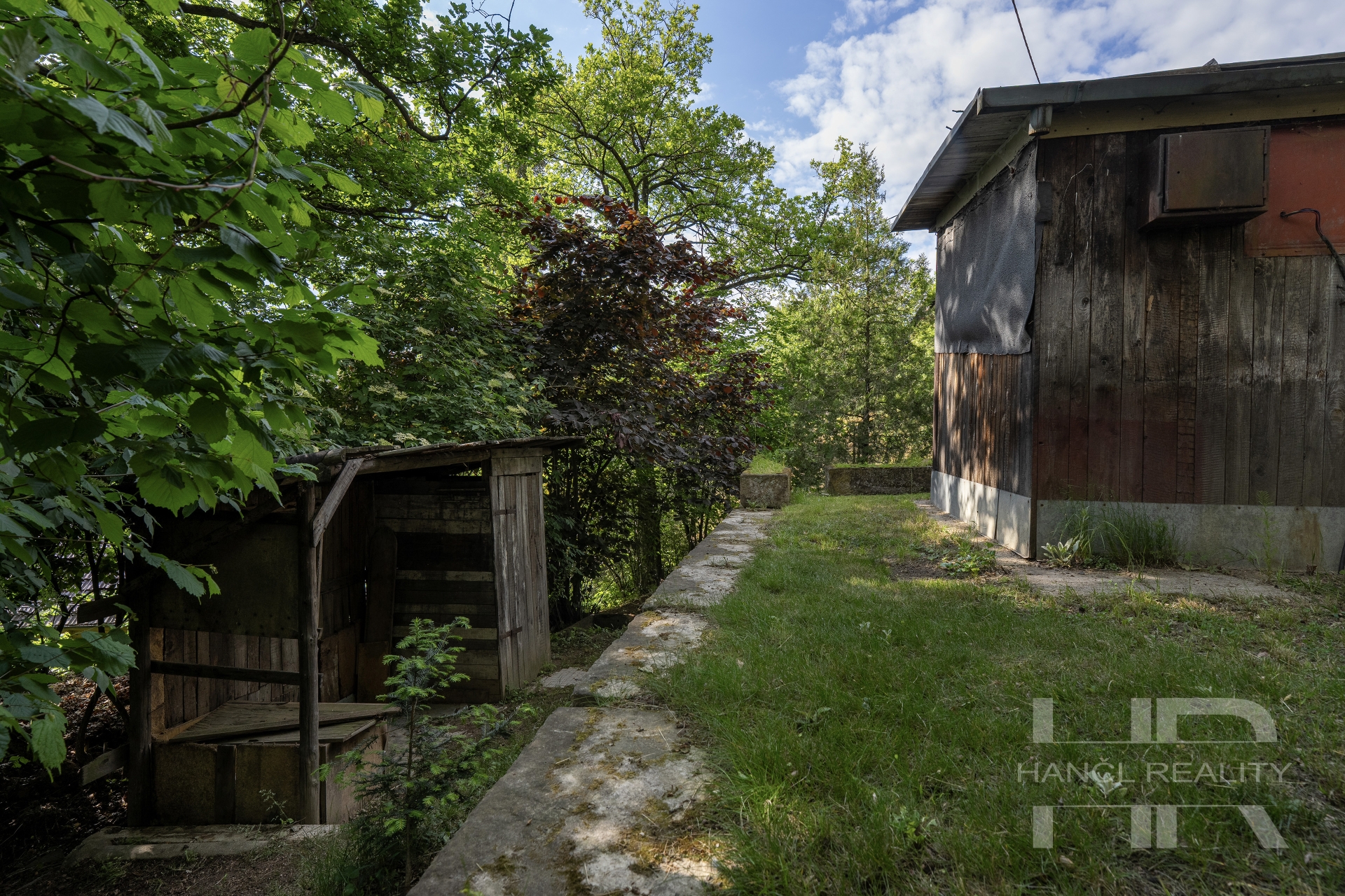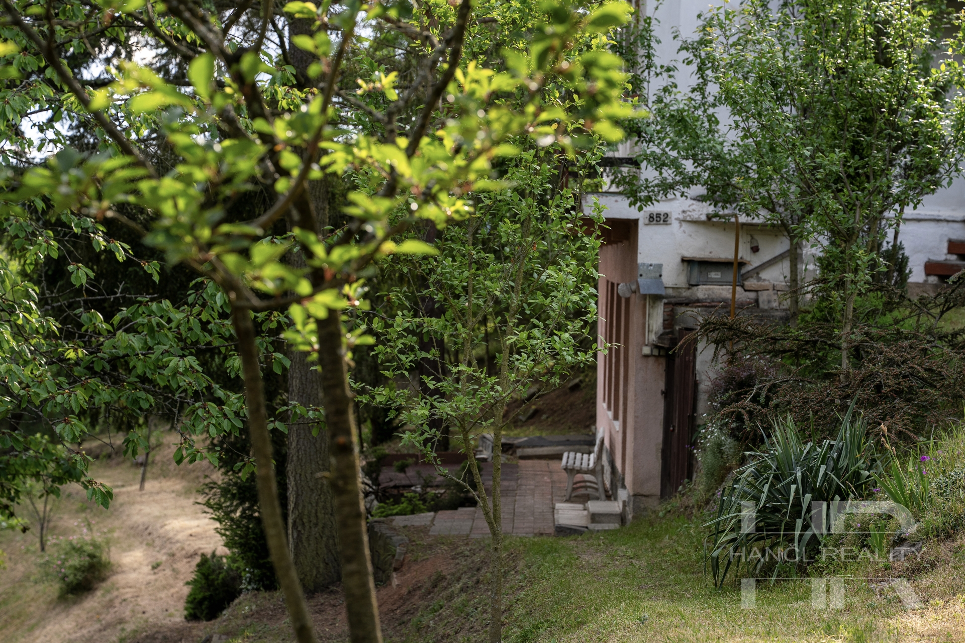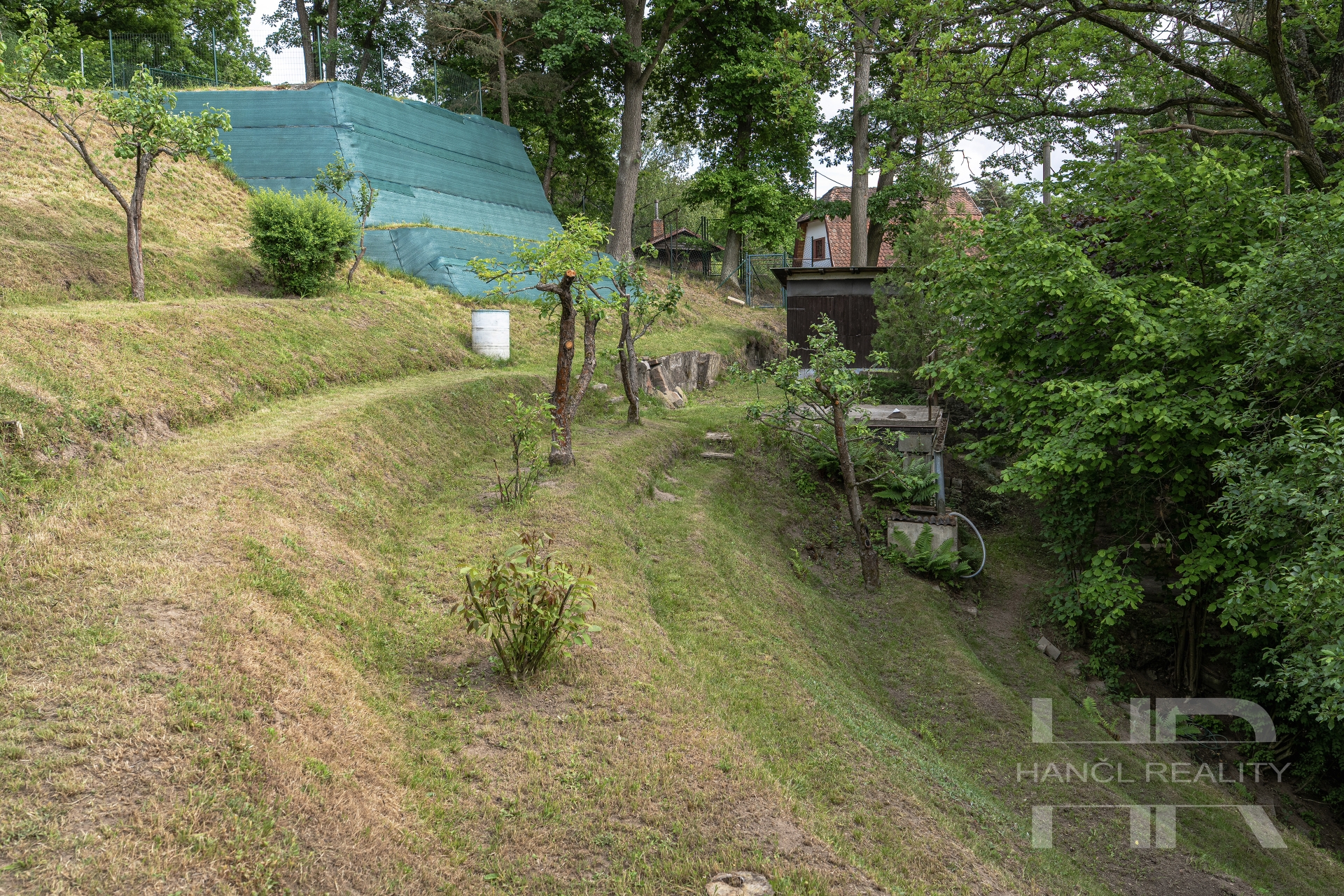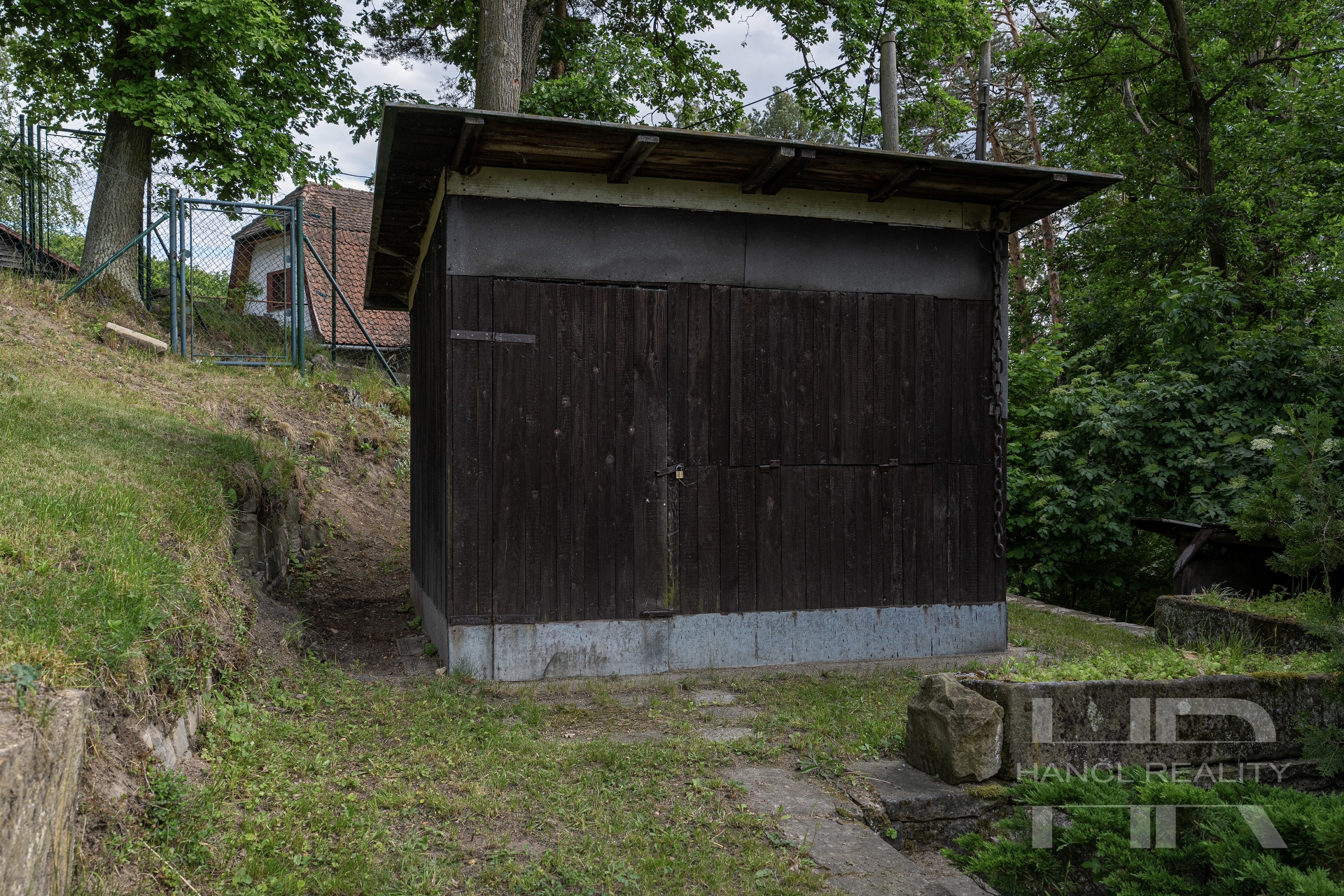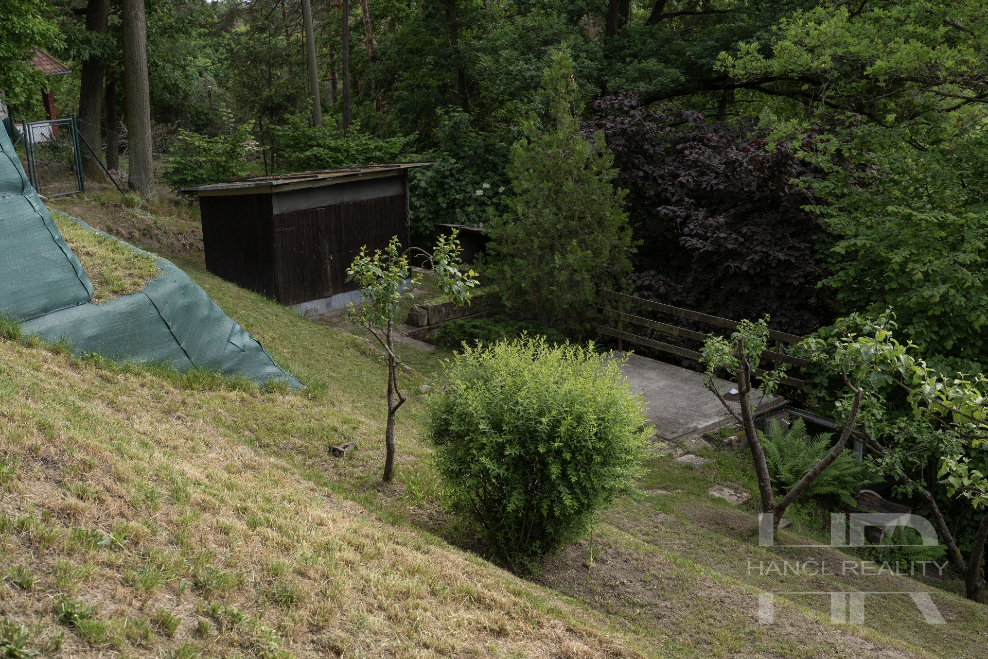 Co se týče přístupové cesty a parkování – možností je několik. Buď na obecním pozemku kousek od hranice parcely, nebo přímo na vlastním pozemku za branou. Počítejte ale s tím, že místo je zde omezené, pokud byste tu chtěli parkovat třeba 5 aut, tak je sem bohužel nevměstnáte. Navíc vzhledem ke sklonu příjezdové cesty musíte počítat s možnými komplikacemi (zejména pokud by napadlo větší množství sněhu), což můžete řešit menší úpravou cesty a jejím zpevněním.Zahrada je díky svému tvaru působivě rozlehlá – dojít z jednoho konce na druhý chvíli trvá. Vstup na pozemek by byl možný z obou jeho konců, v praxi se ale využívá jen jeden. V jeho blízkosti najdete i menší sklípek na potraviny, zejména pro uskladnění ovoce, dále pak ohniště s posezením a něco na způsob dřevníku, či takového skladu zahradního nářadí. Až se tu budete zabydlovat, tak si ale ohniště s posezením určitě uděláte po svém, protože stávající už má to nejlepší za sebou.